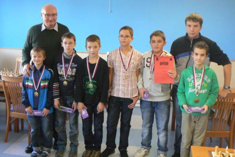 KS družstev mladších žáků, Staré Město 22.10.2013 (družstvo B) zleva:trenér František Veselský, Vojtěch Valůšek, Jáchym Karlík, Jan Sušeň, Jakub Husička, Adam Březina, Tomáš Galda a trenér Josef Bednařík - 1. místo - postup do KP